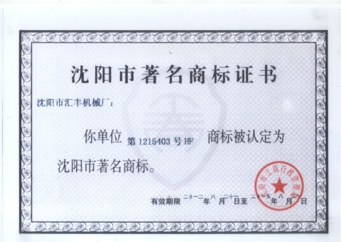沈阳汇丰机械厂于2012年获得“沈阳市著名商标”
